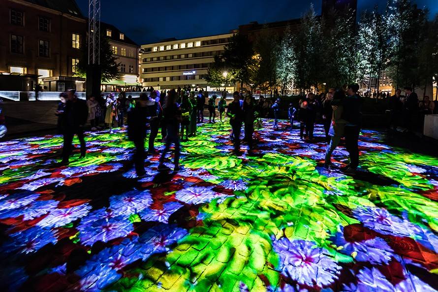 户外的投影,代表着无穷无尽的投影媒介。水幕,山体,植物,建筑立面,雕塑等不同的材质和形态,通过不同的方法来吸收和消除投射在投影上的光。