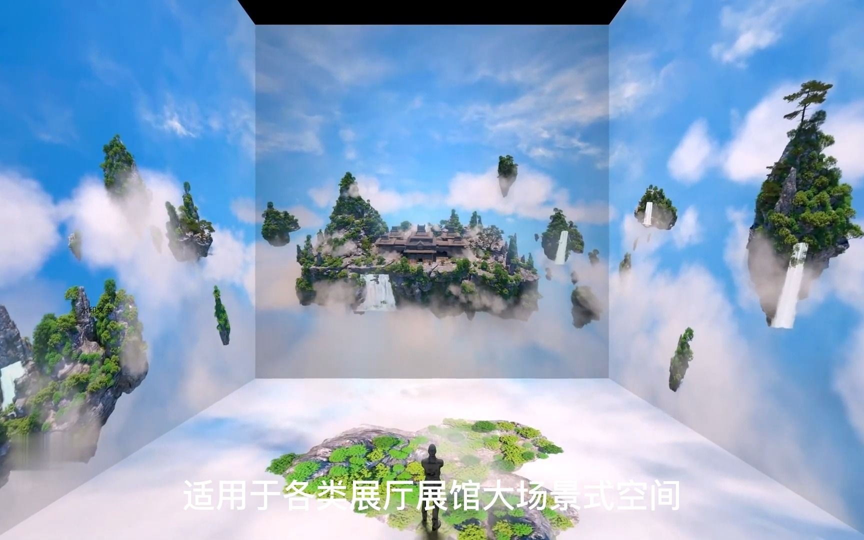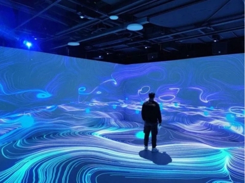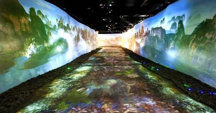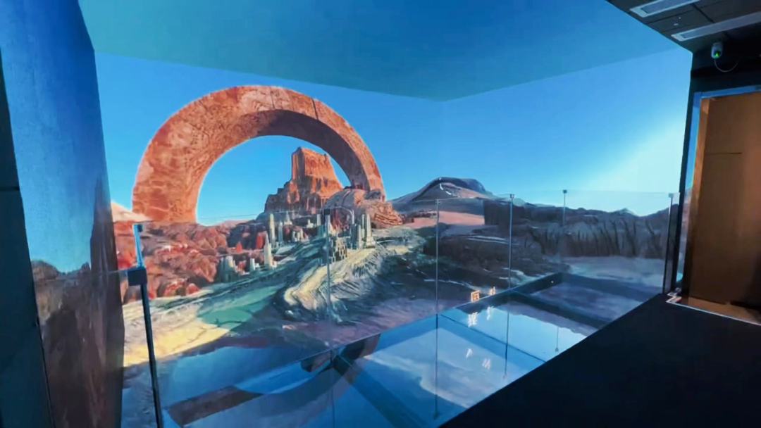 CAVE空间又叫沉浸式投影,是通过多通道融合技术将多台投影机的画面无缝拼接融为一个画面,通过空间结构和画面的融合达到沉浸式效果,使得观众置身于影片之中。