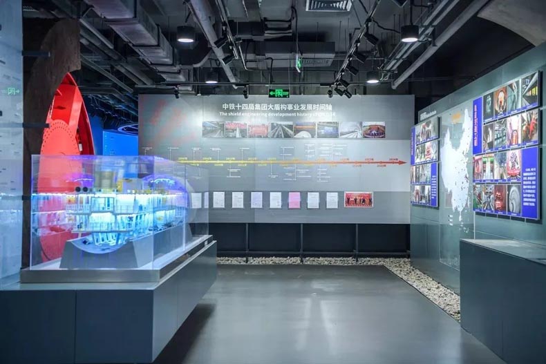 大盾构博物馆作为中国唯一专业展示“大盾构”的博物馆,分为环形影幕厅、主展示大厅、沙盘模型厅三个部分。对中铁十四局大直径盾构施工的成长脉络、事业发展、重点工程、业界地位等进行全面展示。