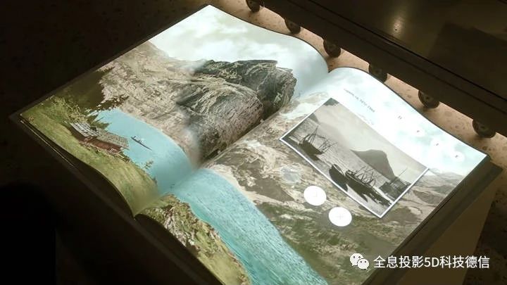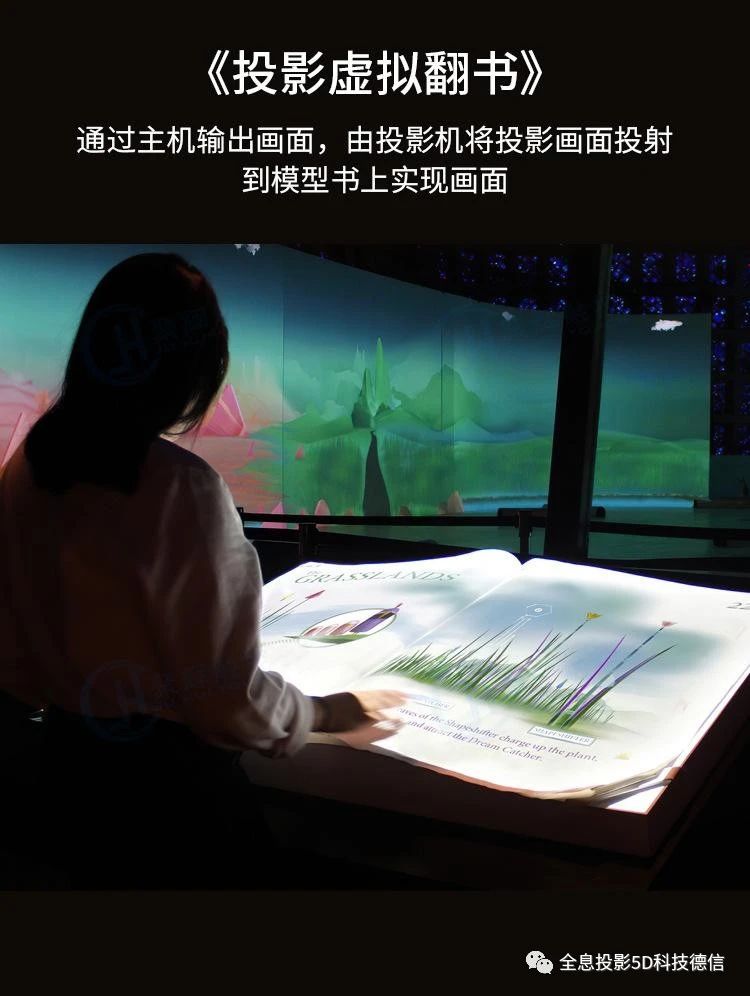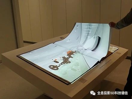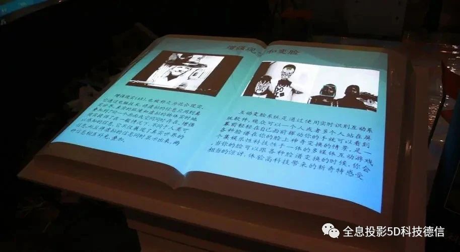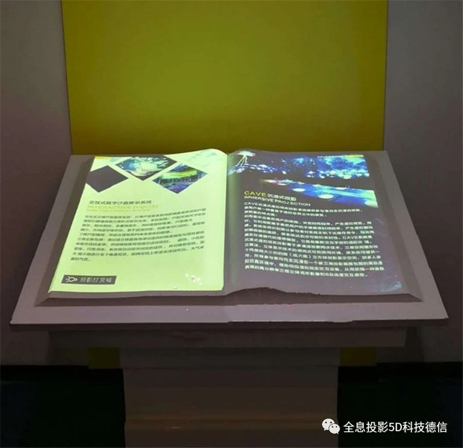 投影翻书又称电子翻书、互动翻书、翻书软件、隔空翻书、空中翻书、自动翻书、魔幻翻书、立体翻书、虚拟翻页、虚拟电子书等 。桌面上有一本翻开的虚拟图书,当观众伸手做出翻书的动作时,会惊喜地发现这本虚拟图书竟然真的可以翻页,展示栩栩如生的动态翻页效果并伴有音效。观众在惊叹神奇的虚拟技术的同时,也势必会对图书的内容产生兴趣。具有较好的互动性,是展厅多媒体内容展示的高科技产品。