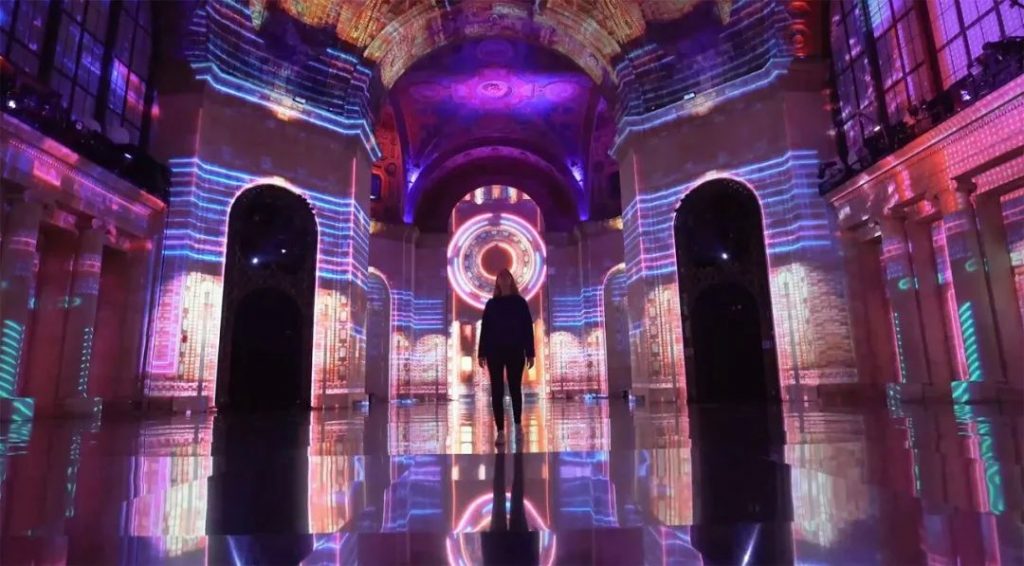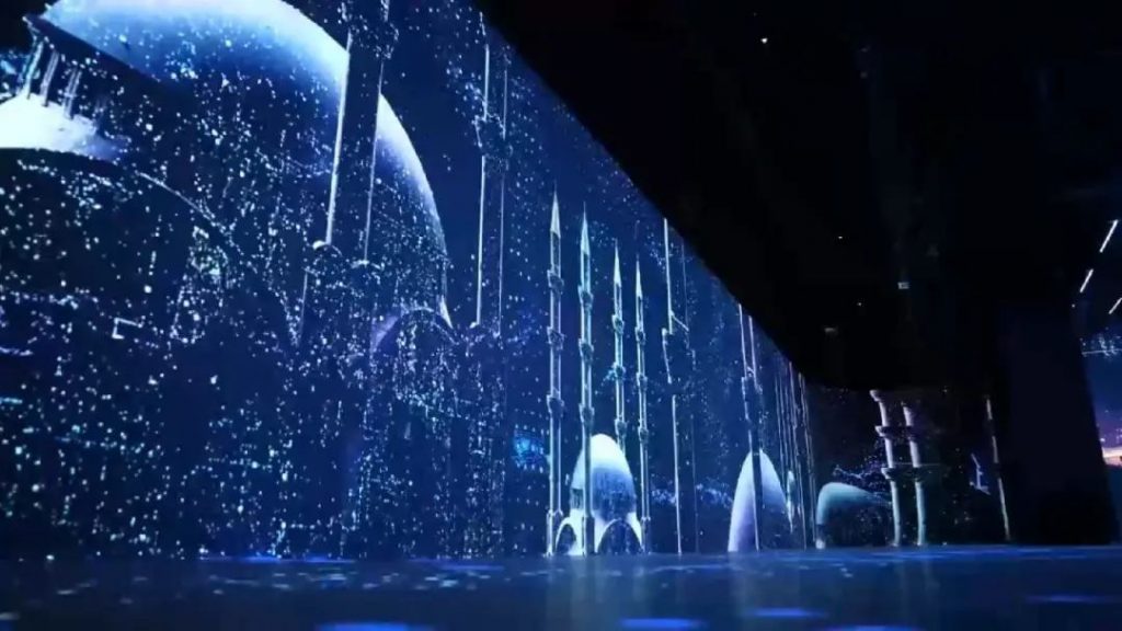 创作团队通过360°投影贴图,交互式视觉效果,照明,场景设计和身临其境的声音融合在一起,创造了一种使感官愉悦的体验。为了突出建筑物的雄伟内部,该团队创造了五个独特的环境,每个环境都有独特的叙述。