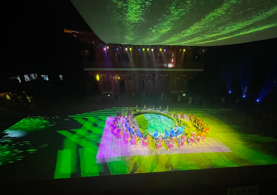 走近古老的神秘英雄史诗,品味别样的文化视听盛宴。中国首部苗族大型山水实景演出《西江盛典》,以贵州雷山大塘景区原始苗寨风貌和周边自然景观为依托,由十余台激光旗舰工程投影机呈现。随着舞台剧情的推进,在专业演员动情演绎下,点亮环形幕、圆形地面旋转舞台和巨型牛头雕塑,倾力打造一场苗族历史文化与投影科技完美融合的视觉奇观。观众漫游其中,聆听历史典故与民间传说,欣赏民风民俗与人文景观,沉浸式感受苗族文化风情。