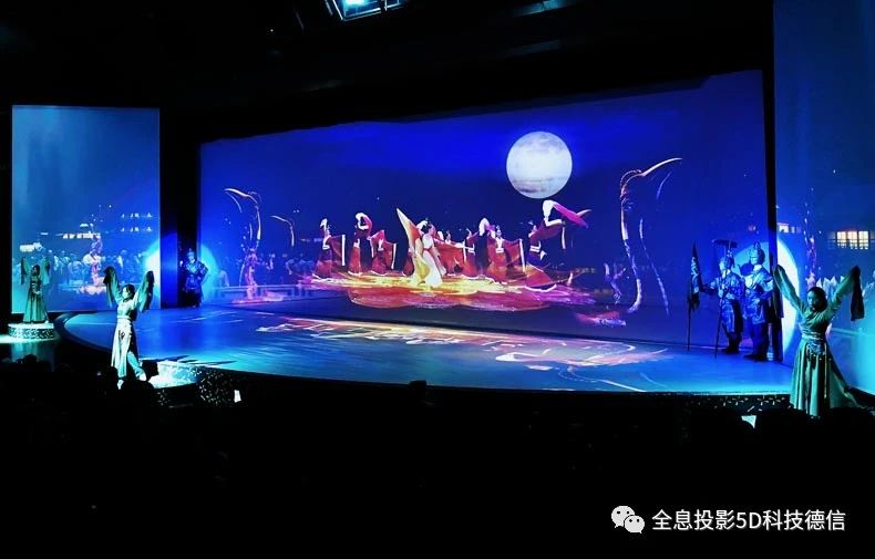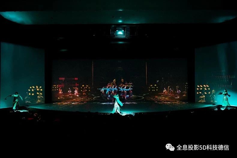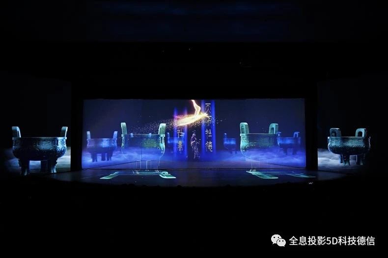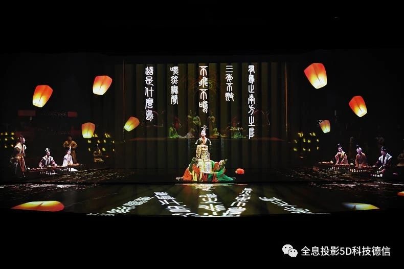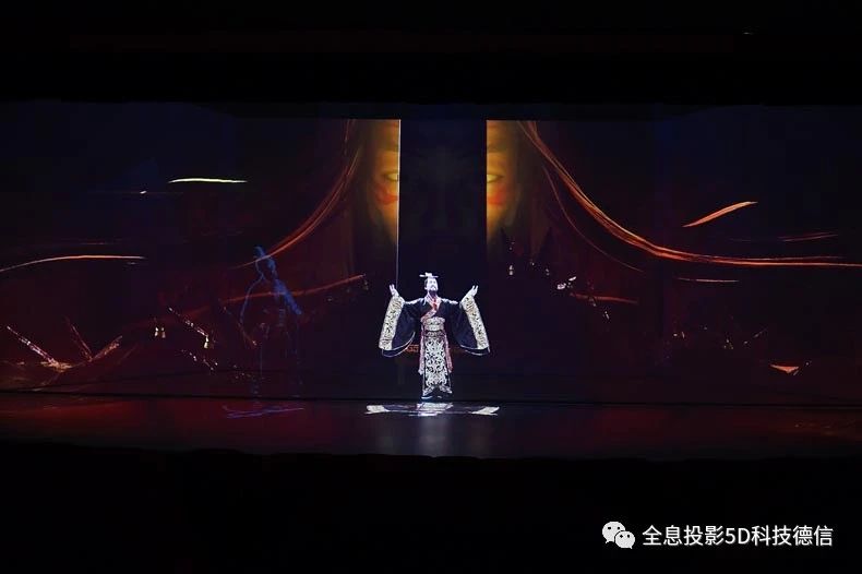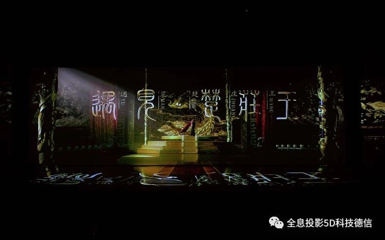 伴随着剧幕缓缓拉开,现场观众犹如置身亦真亦幻的时空隧道,梦回春秋战国时期传奇楚国。通过多组复杂的投影融合,瞬间将剧场打造为巨型的沉浸式空间,与古乐、演员配合的丝丝入扣。