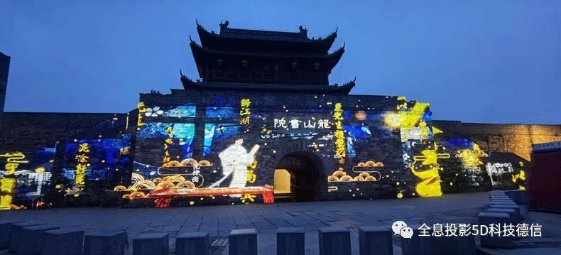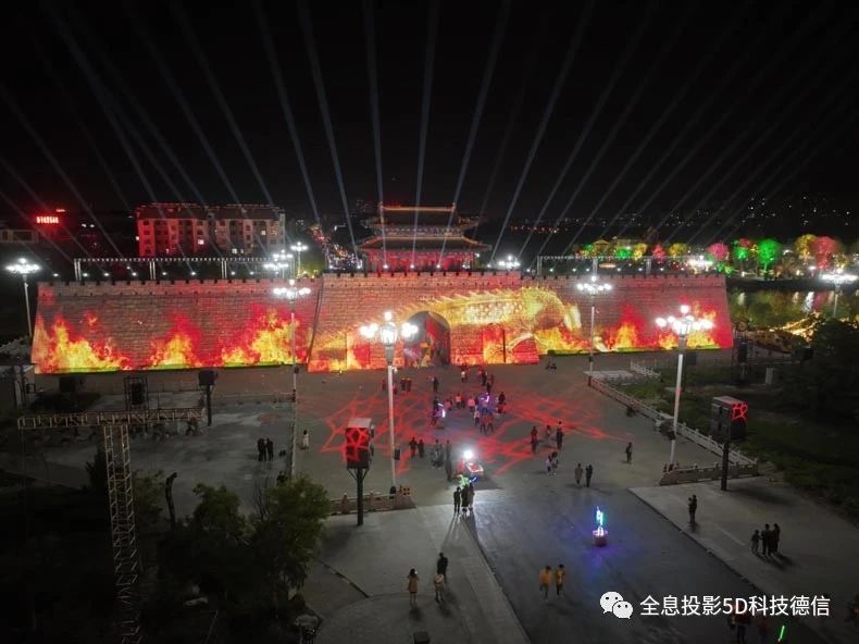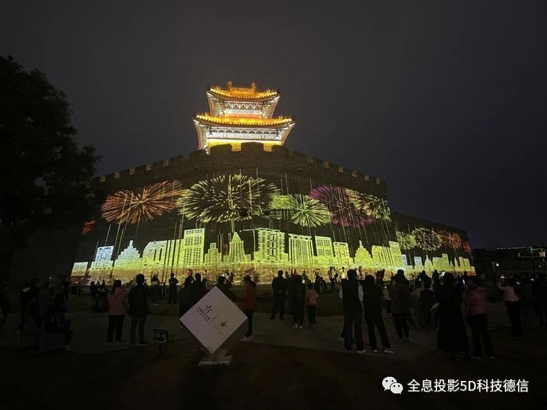 华灯初上,霓虹璀璨,数台40000流明4K激光工程投影机将靖安门古城墙点亮,流光溢彩的3D Mapping投影秀带领游客感受“东方兵学圣典”的独特文化魅力,一览古代春秋的繁华盛景。