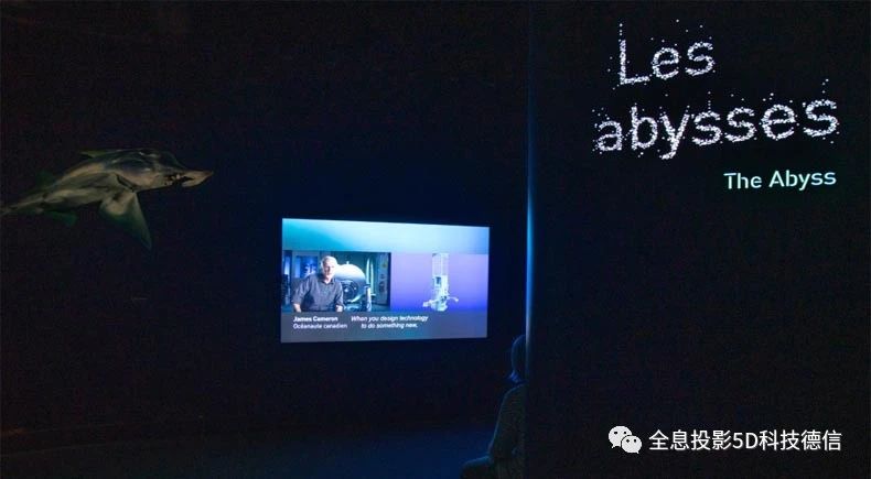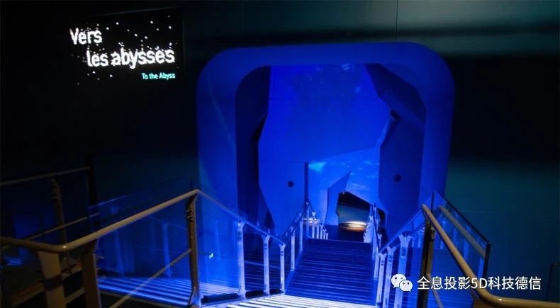 博物馆希望通过在展区入口的楼梯间设置投影影像,来展现潜入深海的感觉。但由于空间场地限制,投影画面只能显示在蓝色和灰色的墙面上,并且投影机需要足够小巧,以应对狭小的安装空间。这要求投影机需要有轻巧机身、短焦投射比、高亮度与高对比度。