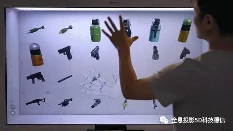 团队在一个透明屏中利用人的视错觉展示不同武器的三维影像,带来了一种新的裸眼3D视觉效果。