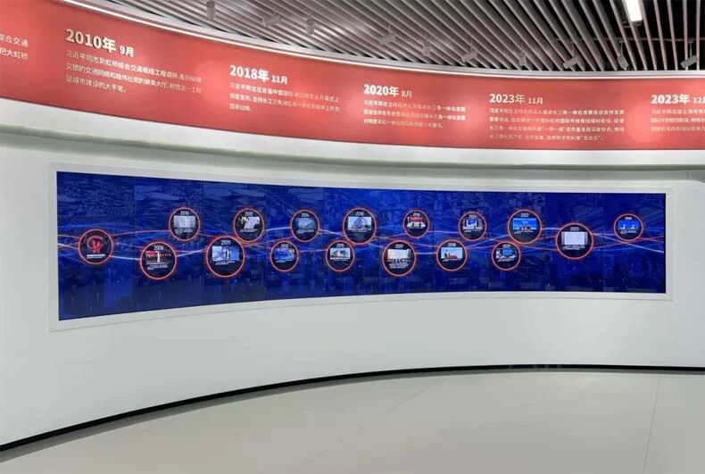 在“发展历程”、“虹桥服务LOGO展示墙”等核心展区,以0.88mm极窄拼缝的拼接屏打造“无缝视界”,结合定制触摸定位框,实现#多屏联动 与云平台数据交互。