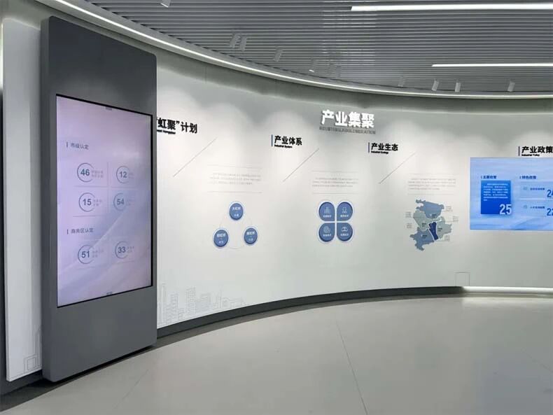 例如,86寸滑轨系统通过红外触控与轨道定位技术,实时联动画面与物理位移,使产业政策解读从单向传播进化为动态探索。这种“空间+数据”的双重交互设计,精准契合政务场景中复杂信息的可视化需求,让观众在指尖滑动间读懂虹桥的产业聚合脉络。